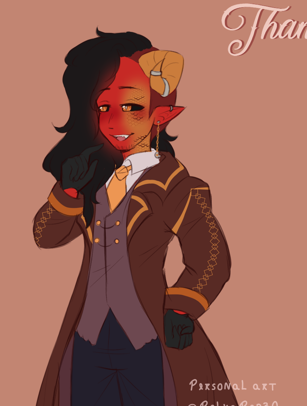 Thanatos é um hibrido de Tiefling com Dragonborn Feiticeiro Dracônico do meu